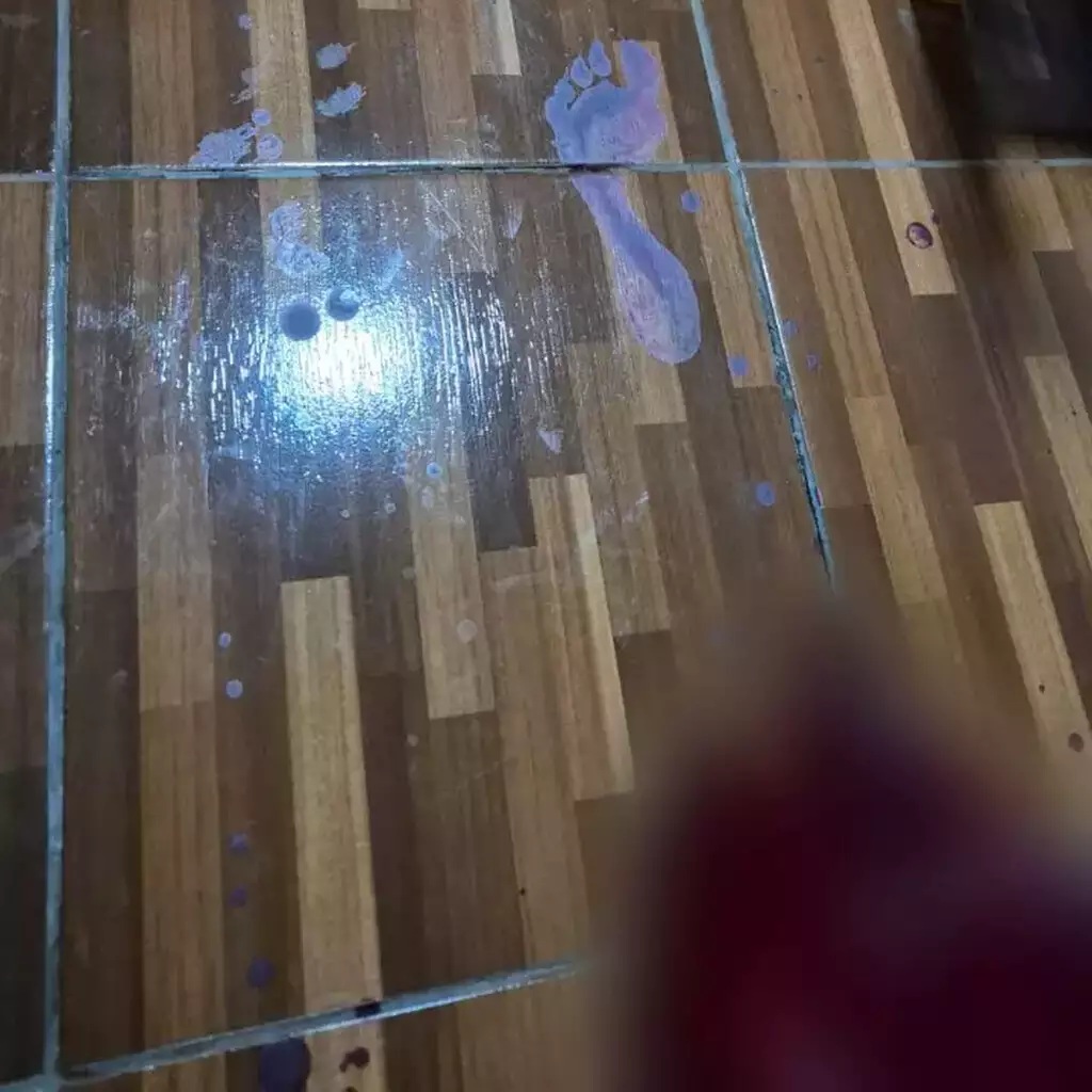 Pegadas marcadas de sangue no chão da casa onde Juliete Vieira foi morta a facadas pelo irmão. Foto: CG News