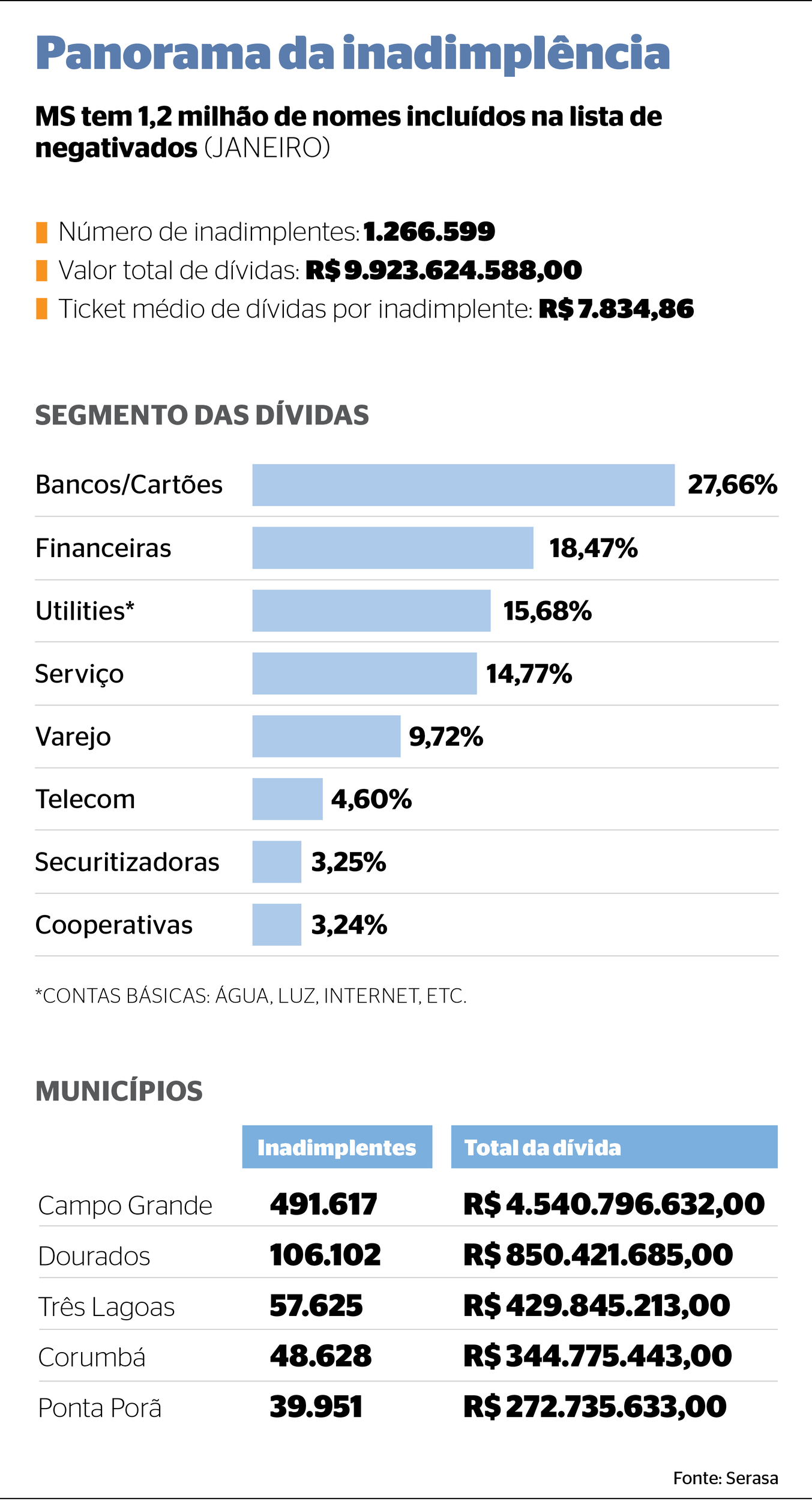Na sequência aparecem Dourados, com 106,1 mil inadimplentes e um estoque de R$ 850,4 milhões em dívidas, e Três Lagoas, em que 57,6 mil consumidores acumulam R$ 429,8 milhões em débitos.